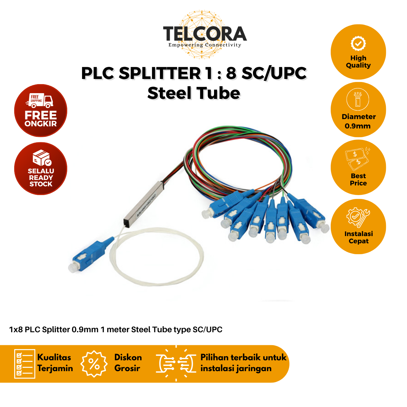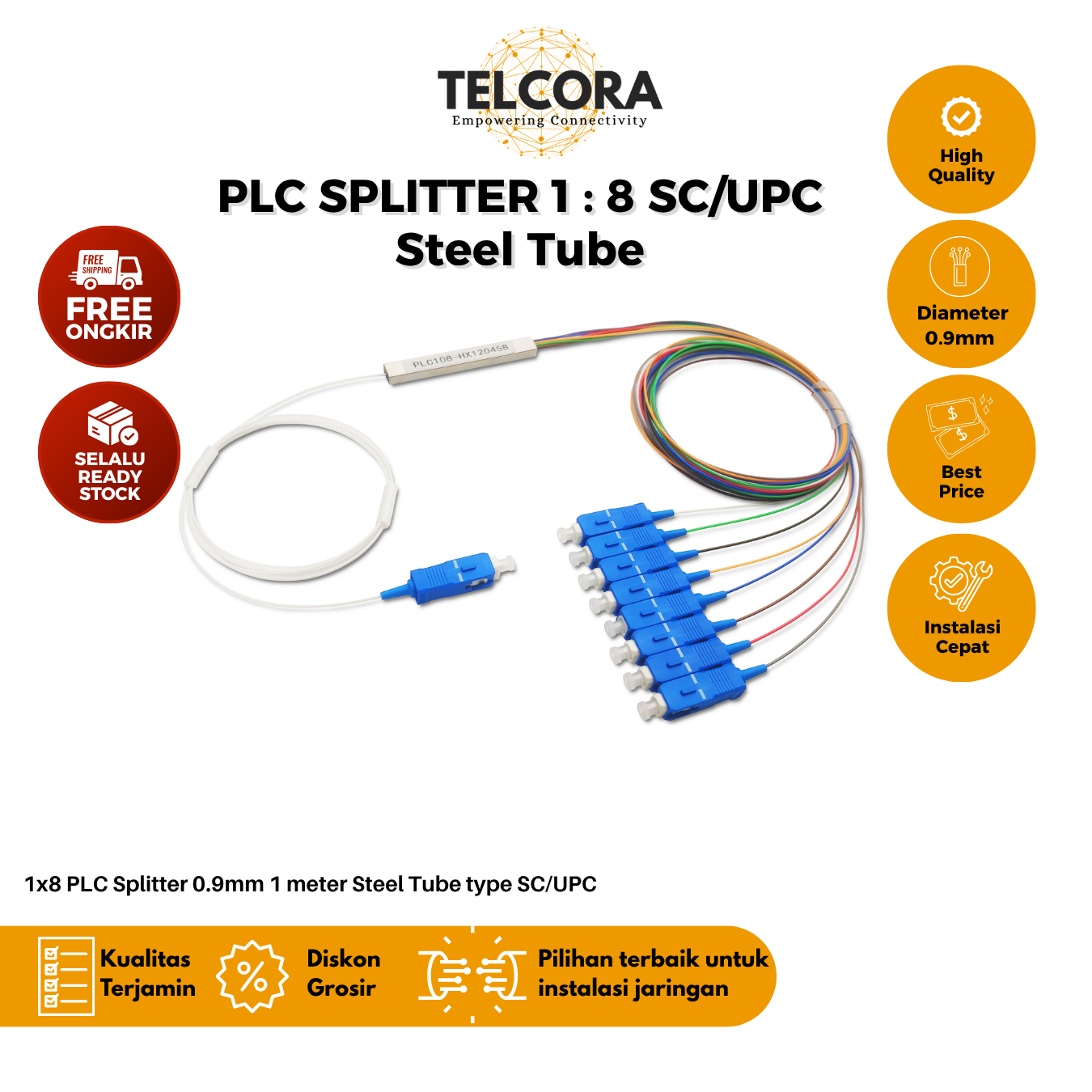 TELCORA Splitter PLC 1:8 Steel Tube SC/UPC Singlemode 0.9mm 1 Meter merupakan perangkat pasif yang berfungsi untuk membagi sinyal optik dari satu input menjadi delapan output secara seimbang.