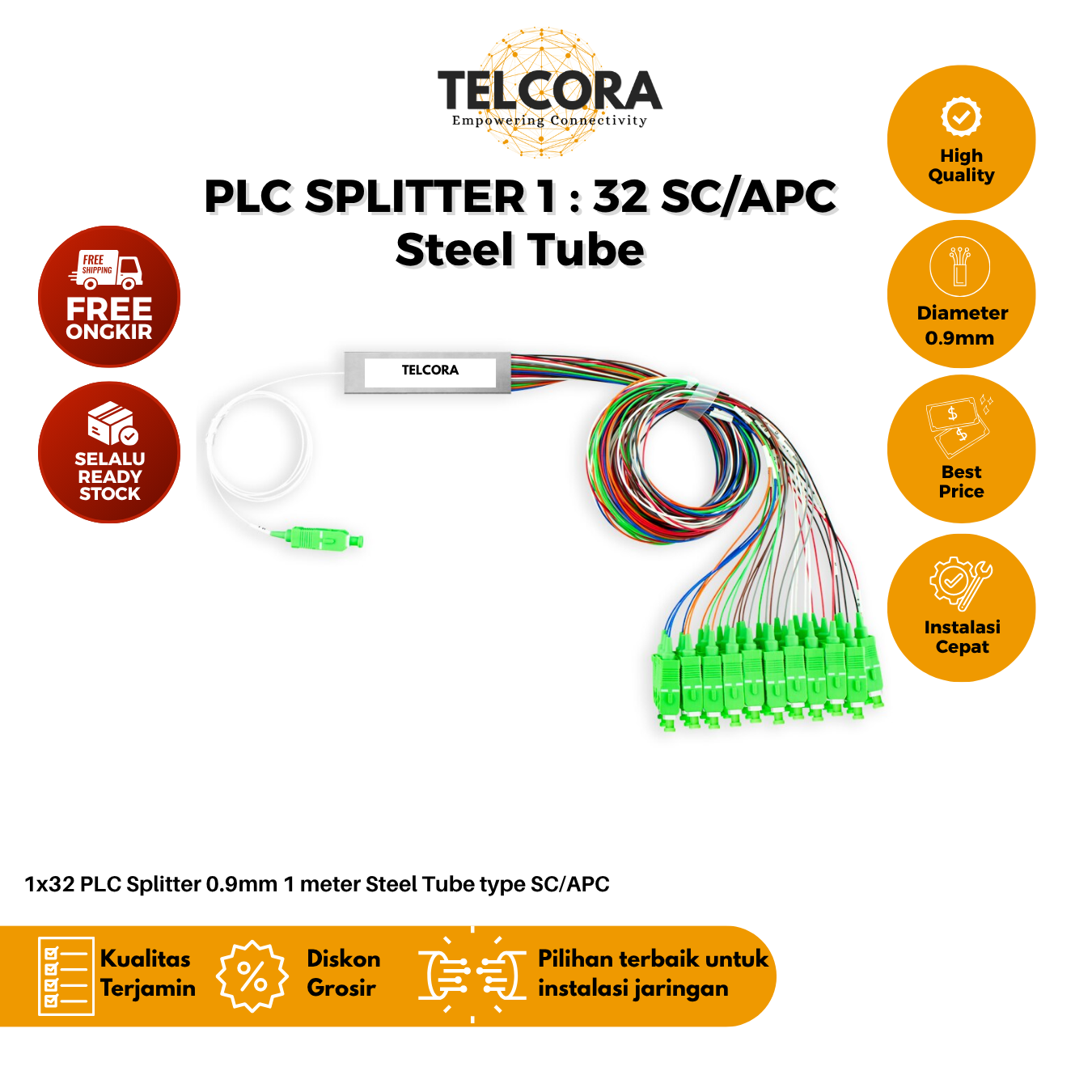 TELCORA Splitter PLC 1:32 Steel Tube SC/APC Singlemode 0.9mm 1 Meter adalah perangkat pasif yang digunakan untuk membagi sinyal optik dari satu input menjadi tiga puluh dua output secara merata.