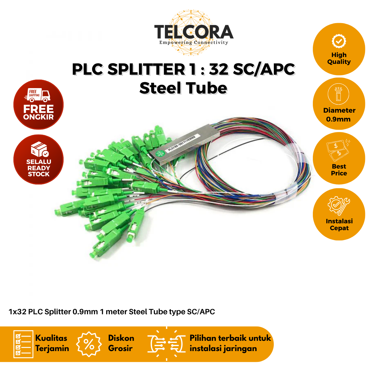 TELCORA Splitter PLC 1:32 Steel Tube SC/APC Singlemode 0.9mm 1 Meter adalah perangkat pasif yang digunakan untuk membagi sinyal optik dari satu input menjadi tiga puluh dua output secara merata.