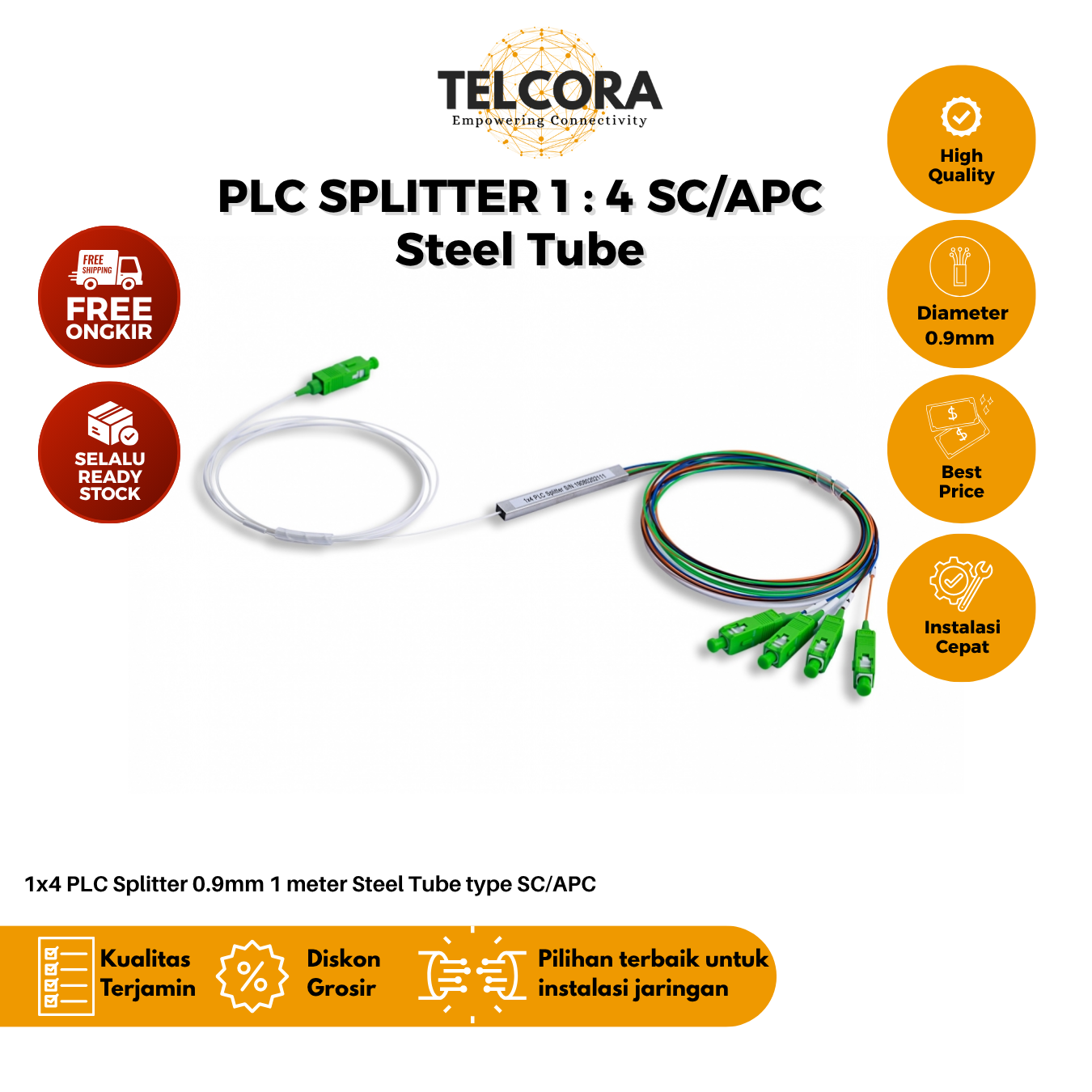 TELCORA Splitter PLC 1×4 Steel Tube SC/APC Singlemode 0.9mm 1 Meter merupakan perangkat pasif yang berfungsi untuk membagi sinyal optik dari satu input menjadi empat output dengan akurasi tinggi.